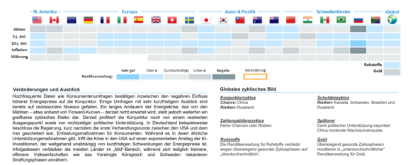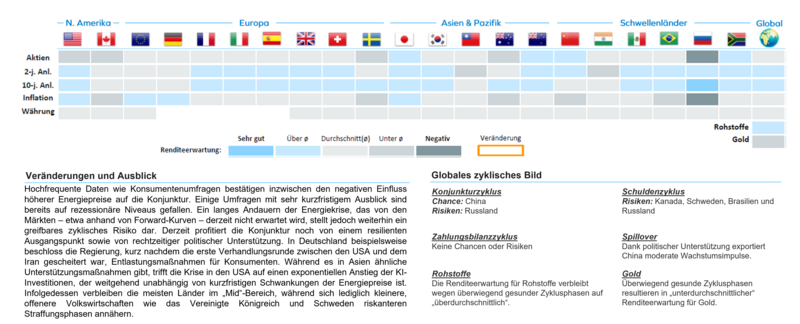 Die zyklische Analyse beginnt bei den drei größten Wirtschaftsregionen USA, China und der Eurozone, welche die globale Asset Allokation maßgeblich beeinflussen. Insgesamt werden in mehr als 20 Ländern weitere, oft idiosynkratrische Chancen verfolgt. Aus den Zyklusphasen der jeweiligen Länder werden die Chancen und Risiken in den Anlageklassen Aktien, Staatsanleihen, Inflation (inklusive Gold) und Währungen abgeleitet.